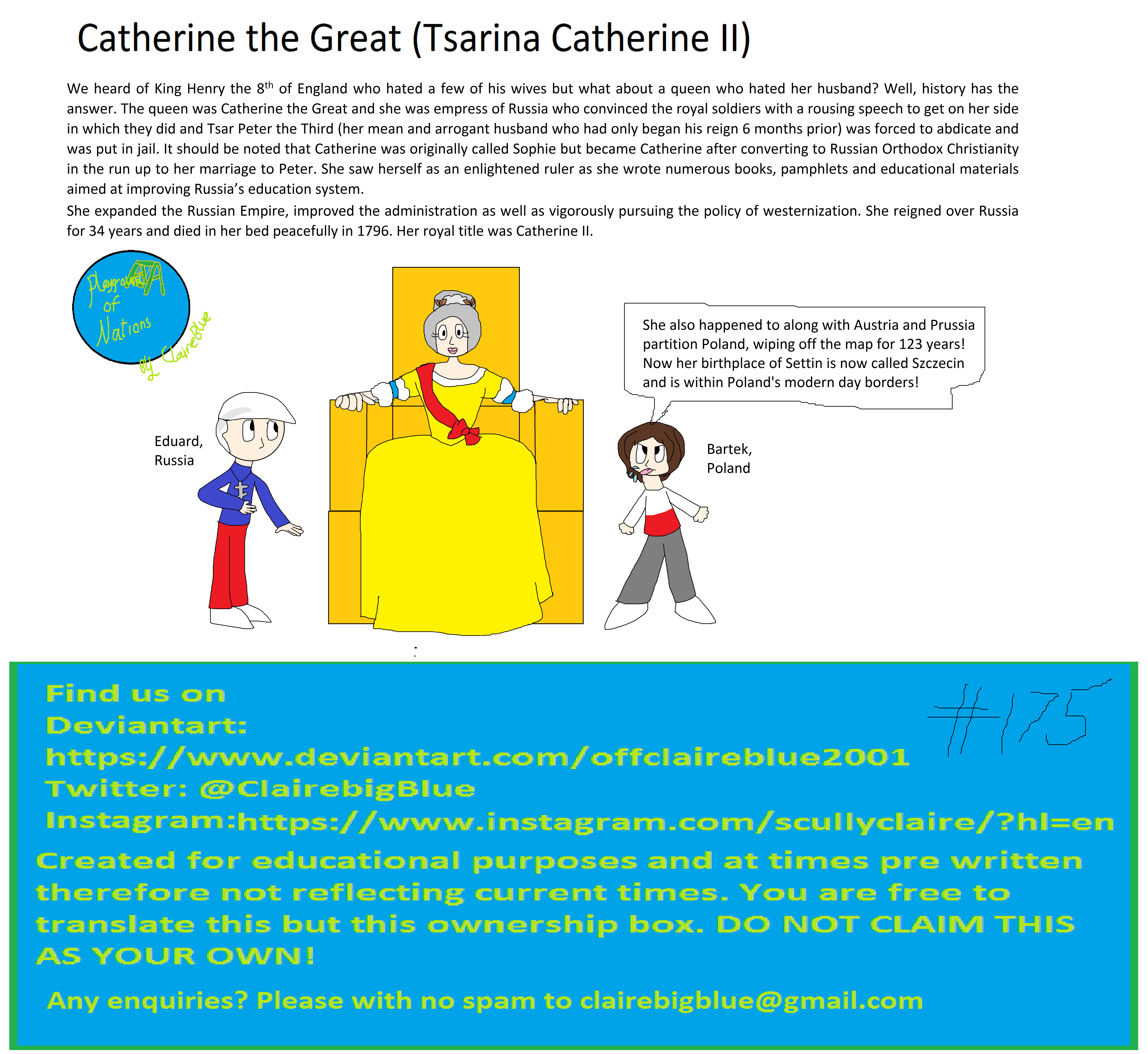 We heard of King Henry the 8th of England who hated a few of his wives but what about a queen who hated her husband? Well, history has the answer. The queen was Catherine the Great and she was empress of Russia who convinced the royal soldiers with a rousing speech to get on her side in which they did and Tsar Peter the Third (her mean and arrogant husband who had only began his reign 6 months prior) was forced to abdicate and was put in jail. It should be noted that Catherine was originally called Sophie but became Catherine after converting to Russian Orthodox Christianity in the run up to her marriage to Peter. She saw herself as an enlightened ruler as she wrote numerous books, pamphlets and educational materials aimed at improving Russia's education system. She expanded the Russian Empire, improved the administration as well as vigorously pursuing the policy of westernization. She reigned over Russia for 34 years and died in her bed peacefully in 1796. Her royal title was Catherine II.