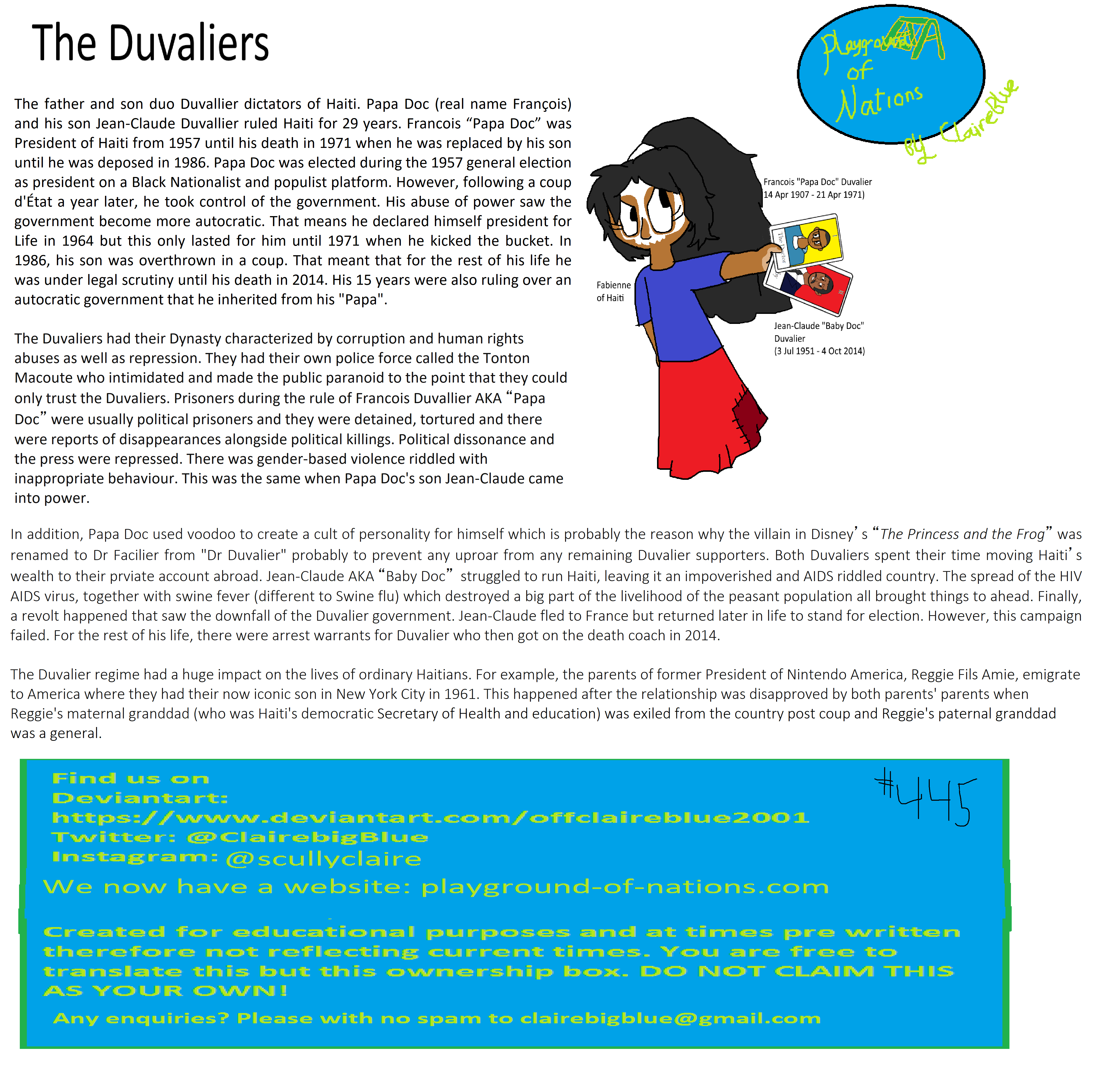 In addition, Papa Doc used voodoo to create a cult of personality for himself which is probably the reason why the villain in Disney’s “The Princess and the Frog” was renamed to Dr Facilier from "Dr Duvalier" probably to prevent any uproar from any remaining Duvalier supporters. Both Duvaliers spent their time moving Haiti’s wealth to their prviate account abroad. Jean-Claude AKA “Baby Doc” struggled to run Haiti, leaving it an impoverished and AIDS riddled country. The spread of the HIV AIDS virus, together with swine fever (different to Swine flu) which destroyed a big part of the livelihood of the peasant population all brought things to ahead. Finally, a revolt happened that saw the downfall of the Duvalier government. Jean-Claude fled to France but returned later in life to stand for election. However, this campaign failed. For the rest of his life, there were arrest warrants for Duvalier who then got on the death coach in 2014.