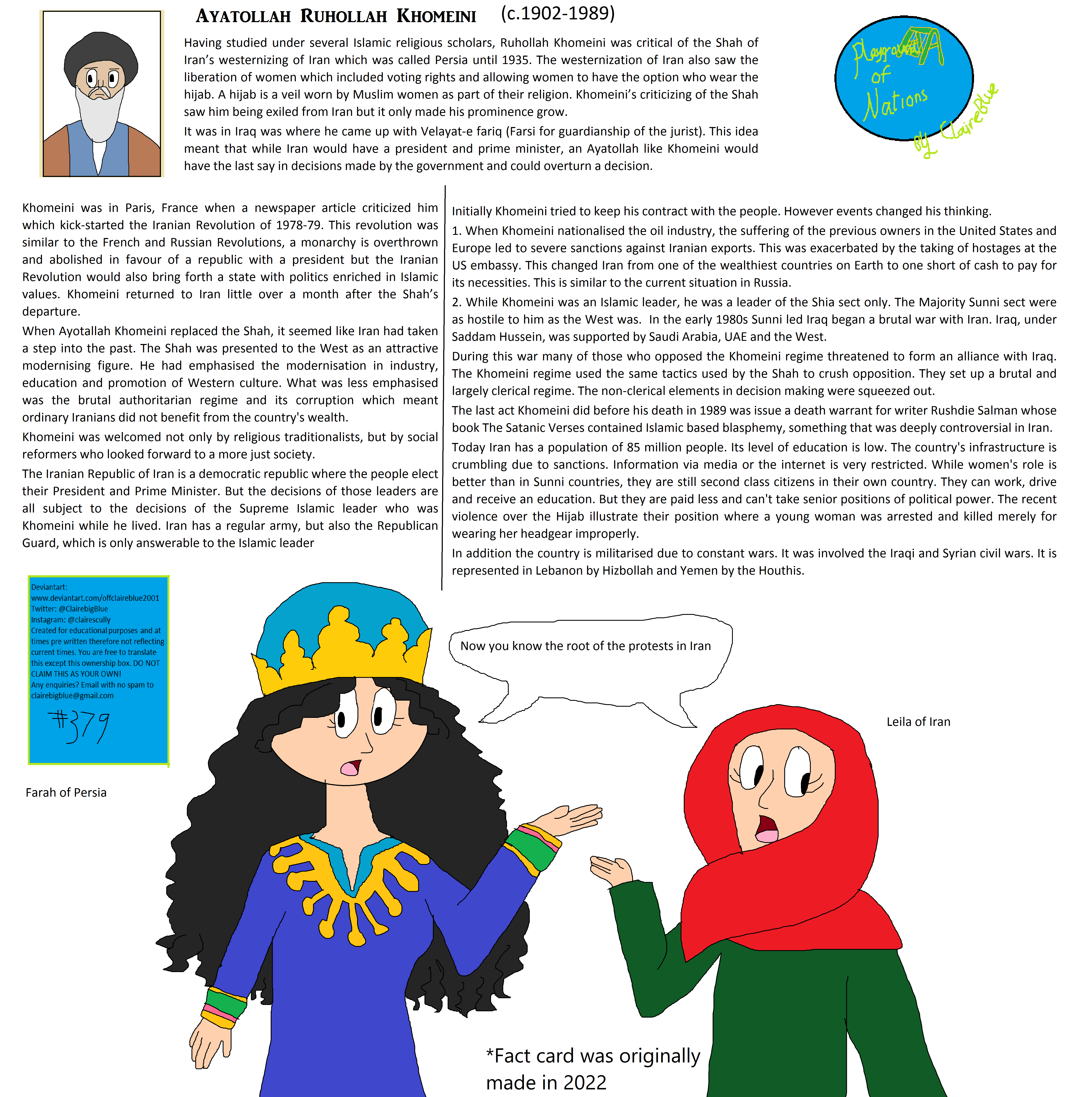 The last act Khomeini did before his death in 1989 was issue a death warrant for writer Rushdie Salman whose book The Satanic Verses contained Islamic based blasphemy, something that was deeply controversial in Iran. Today Iran has a population of 85 million people. Its level of education is low. The country's infrastructure is crumbling due to sanctions. Information via media or the internet is very restricted. While women's role is better than in Sunni countries, they are still second class citizens in their own country. They can work, drive and receive an education. But they are paid less and can't take senior positions of political power. The recent (2022) violence over the Hijab illustrate their position where a young woman was arrested and killed merely for