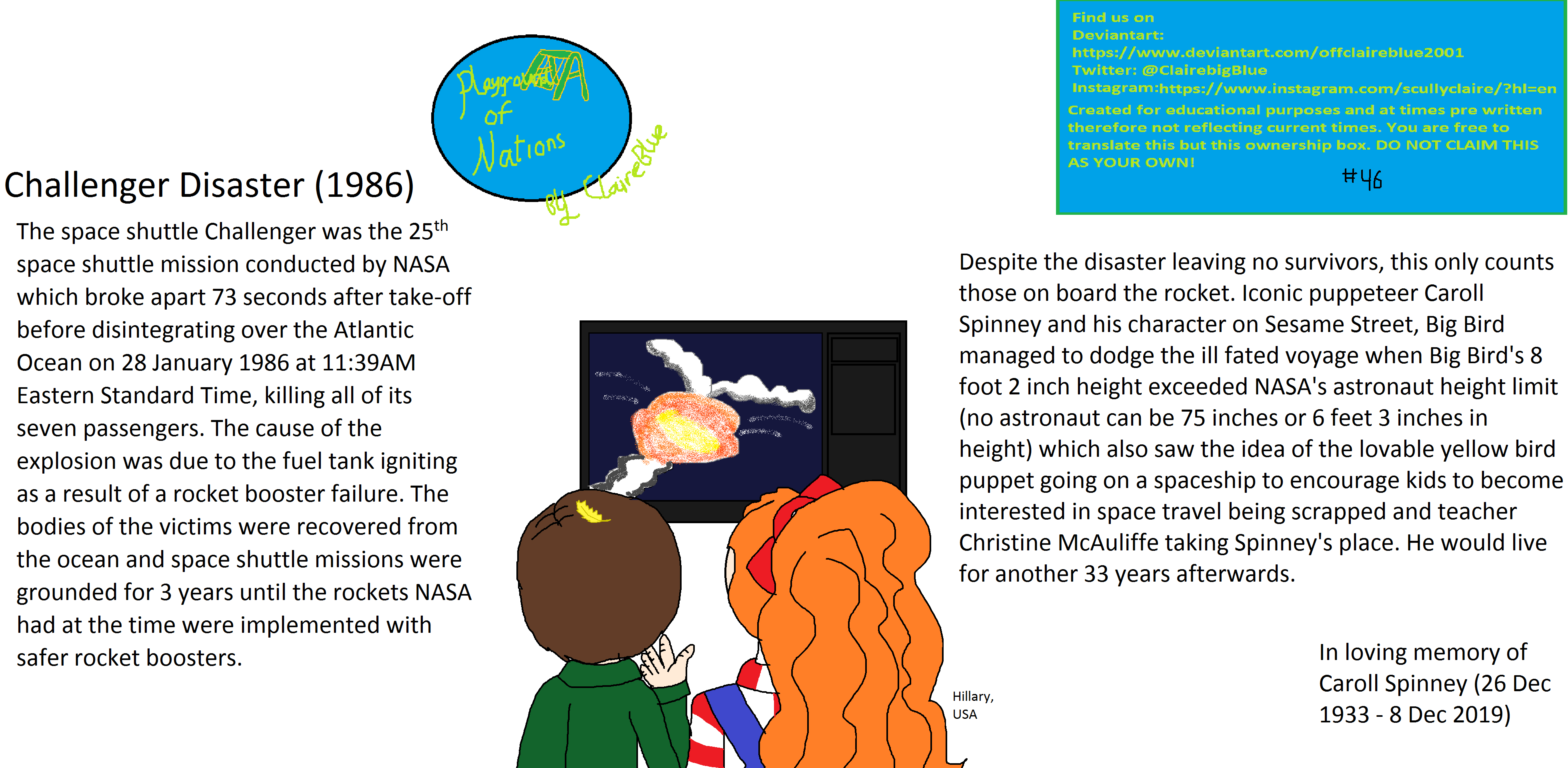 Despite the disaster leaving no survivors, this only counts for those on board the rocket. Iconic puppeteer Caroll Spinney and his character on Sesame Street, Big Bird managed to dodge the ill fated voyage when Big Bird's 8 foot 2 inch height exceeeded NASA's astronaut height limit (no astronaut can be 75 inches or 6 foot 3 inches in height) which also saw the idea of the lovable yellow bird puppet going on a spaceship to encourage kids to become interested in space travel being scrapped and teacher Christine McAuliffe taking Spinney's place. He would live for another 33 years afterwards.