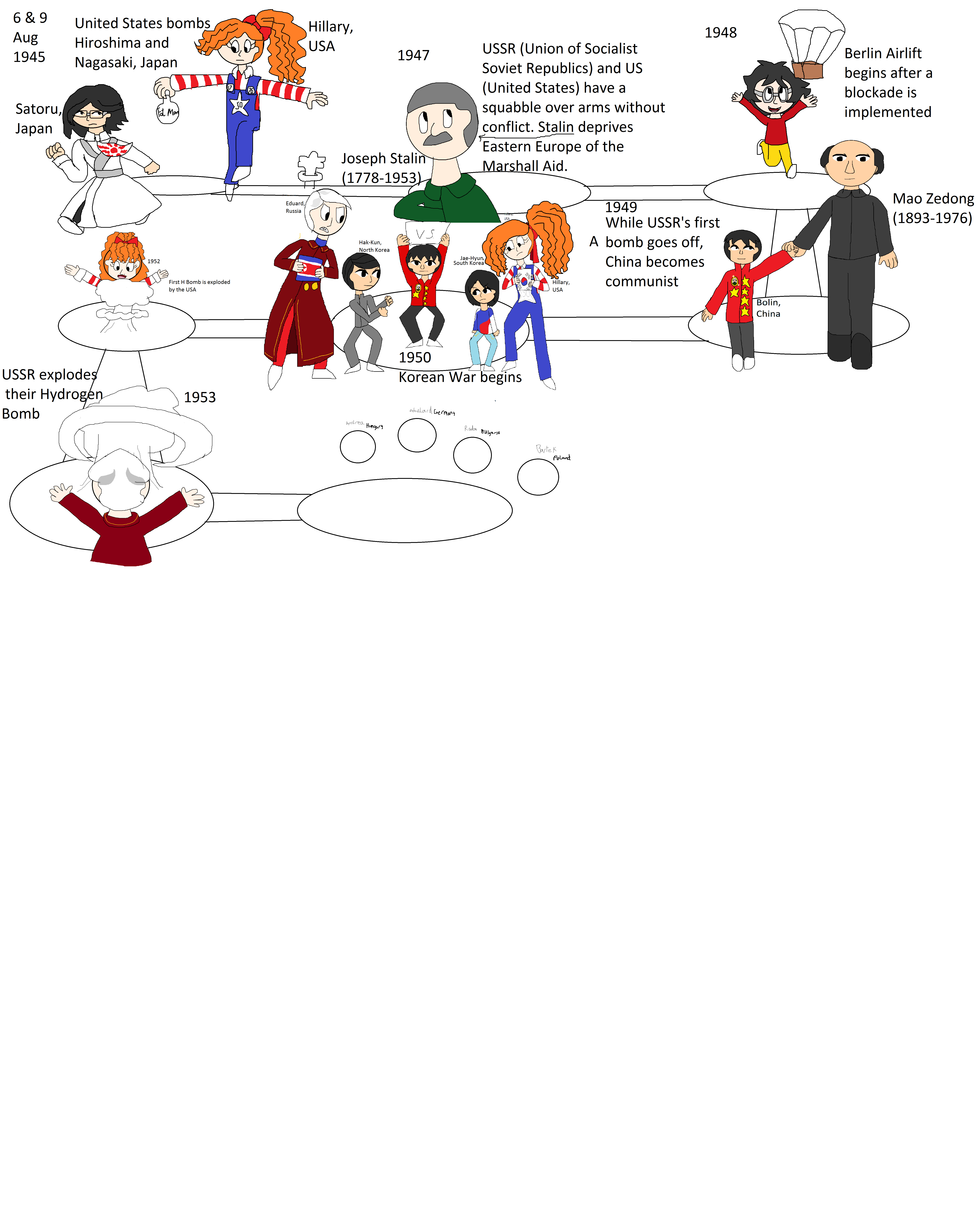 1947: USSR (Union of Socialist Soviet Republics) and the US (United States) have a squabble over arms without conflict. Stalin deprives Eastern Europe of the Marshall Aid