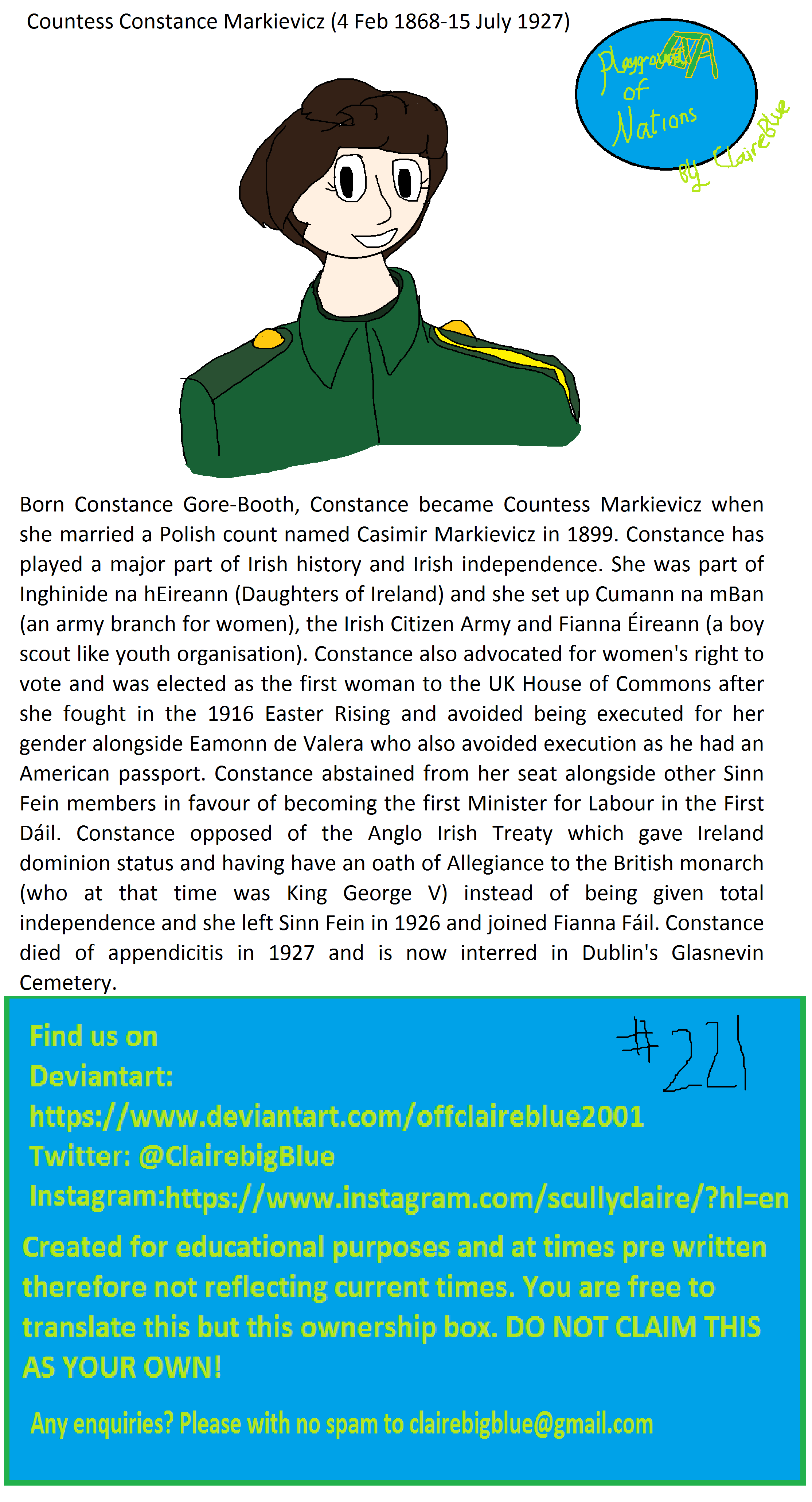 Born Constance Gore-Booth, Constance became Countess Markievicz when she married a Polish count named Casimir Markievicz in 1899. Constance has played a major part of Irish history and Irish independence. She was part of Inghinide na hEireann (Daughters of Ireland) and she set up Cumann na mBan (an army branch for women), the Irish Citizen Army and Fianna Éireann (a boy scout like youth organisation). Constance also advocated for women's right to vote and was elected as the first woman to the UK House of Commons after she fought in the 1916 Easter Rising and avoided being executed for her gender alongside Eamonn de Valera who also avoided execution as he had an American passport. Constance abstained from her seat alongside other Sinn Fein members in favour of becoming the first Minister for Labour in the First Dáil. Constance opposed of the Anglo Irish Treaty which gave Ireland dominion status and having have an oath of Allegiance to the British monarch (who at that time was King George V) instead of being given total independence and she left Sinn Fein in 1926 and joined Fianna Fáil. Constance died of appendicitis in 1927 and is now interred in Dublin's Glasnevin Cemetery.