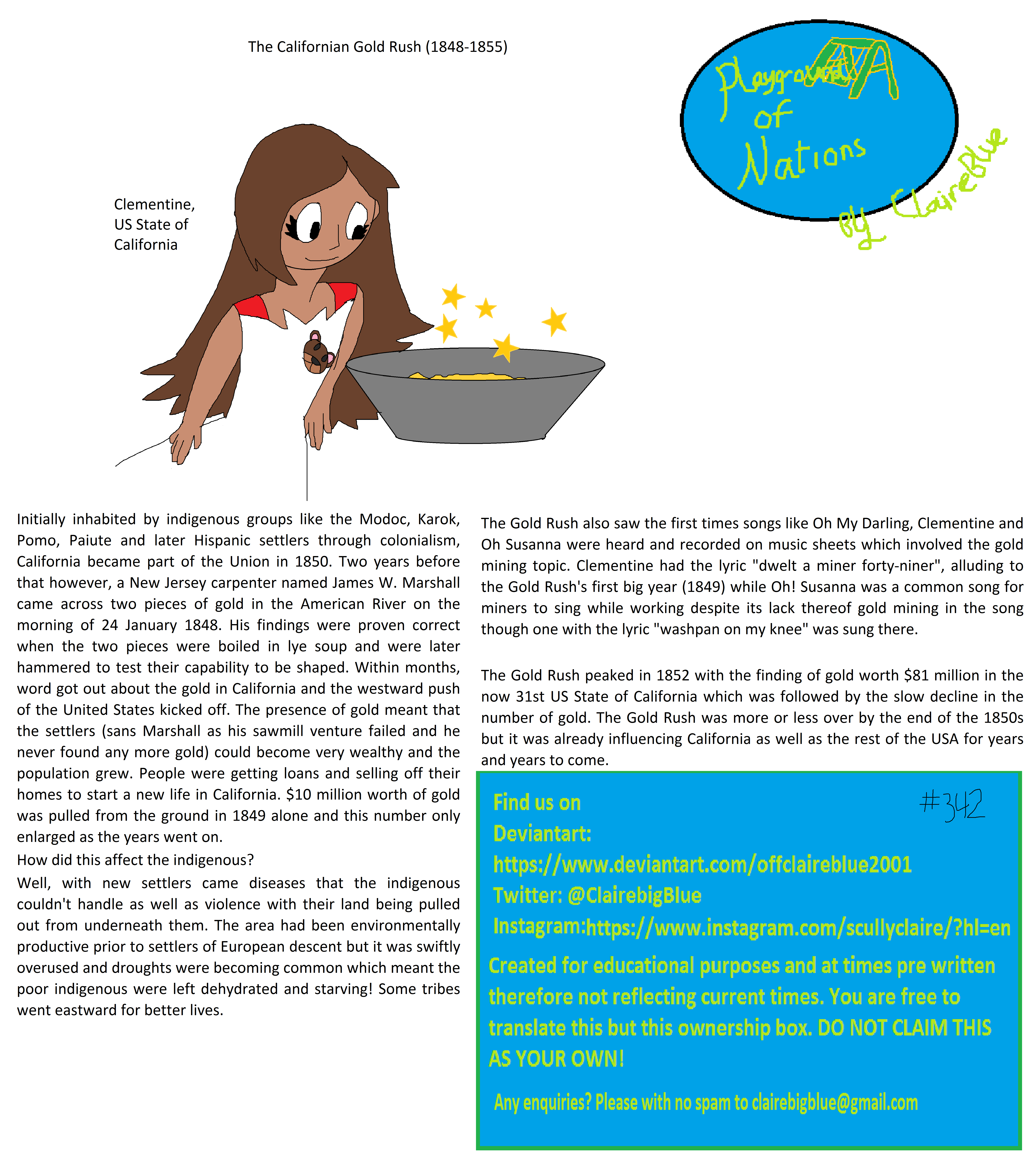 The Gold Rush also saw the first times songs like Oh My Darling, Clementine and Oh Susanna were heard and recorded on music sheets which involved the gold mining topic. Clementine had the lyric "dwelt a miner forty-niner", alluding to the Gold Rush's first big year (1849) while Oh! Susanna was a common song for miners to sing while working despite its lack thereof gold mining in the song though one with the lyric "washpan on my knee" was sung there. The Gold Rush peaked in 1852 with the finding of gold worth $81 million in the now 31st US State of California which was followed by the slow decline in the number of gold. The Gold Rush was more or less over by the end of the 1850s but it was already influencing California as well as the rest of the USA for years and years to come.