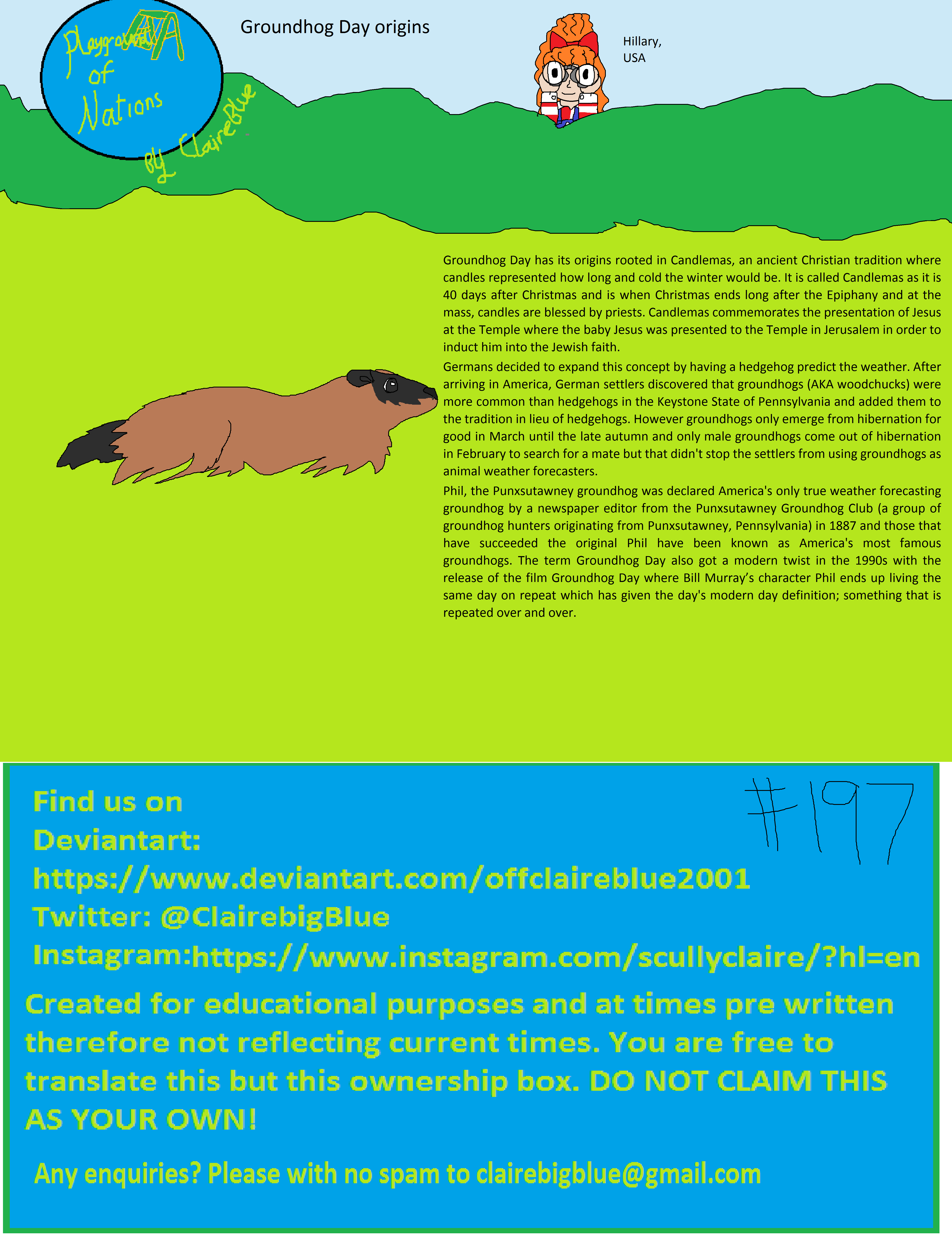 Phil, the Punxsutawney groundhog was declared America's only true weather forecasting groundhog by a newspaper editor from the Punxsutawney Groundhog Club (a group of groundhog hunters originating from Punxsutawney, Pennsylvania) in 1887 and those that have succeeded the original Phil have been known as America's most famous groundhogs. The term Groundhog Day also got a modern twist in the 1990s with the release of the film Groundhog Day where Bill Murray’s character Phil ends up living the same day on repeat which has given the day's modern day definition; something that is repeated over and over.