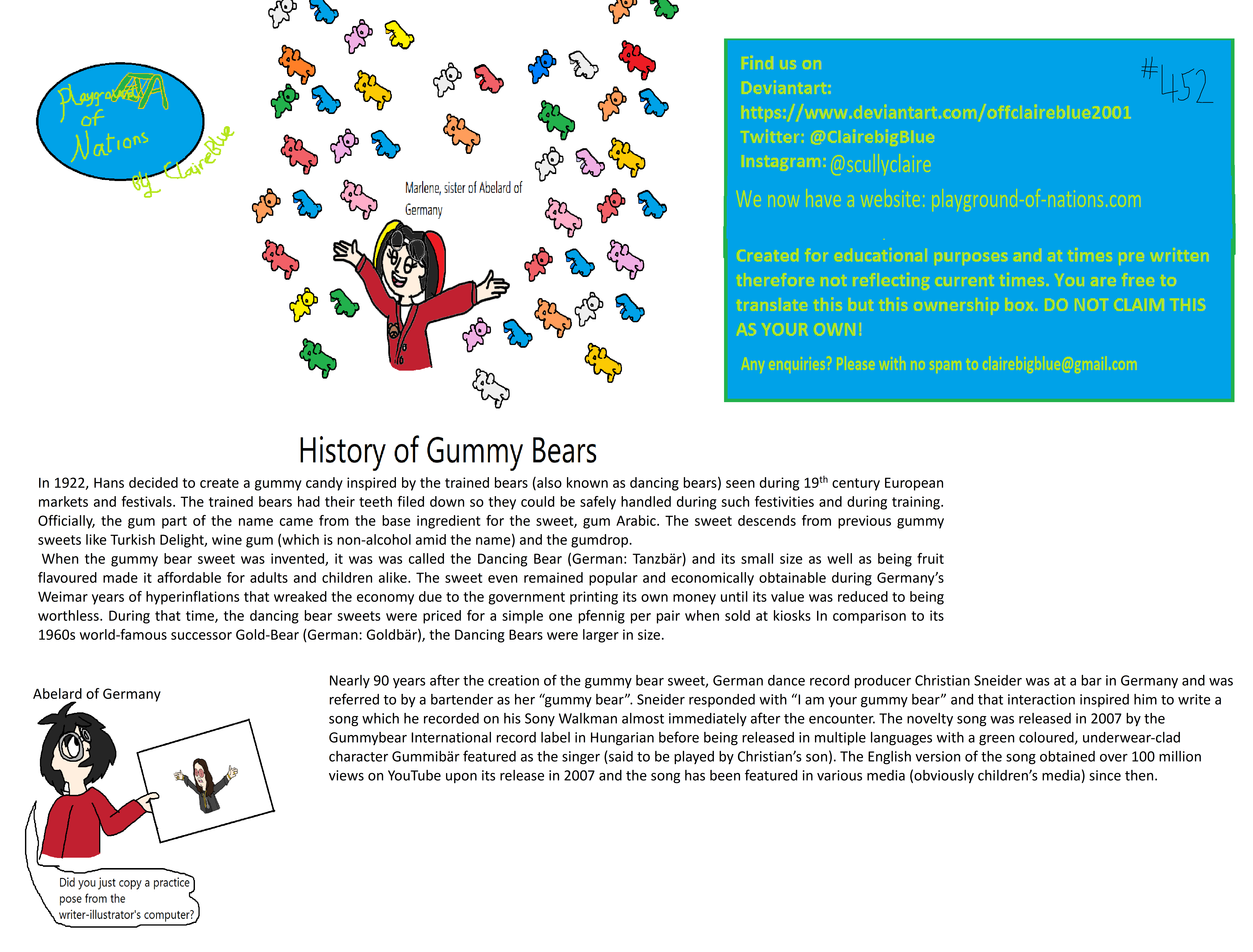 sweets like Turkish Delight, wine gum (which is non-alcohol amid the name) and the gumdrop.When the gummy bear sweet was invented, it was was called the Dancing Bear (German: Tanzbar) and its small size as well as being fruit flavoured made it affordable for adults and children alike. The sweet even remained popular and economically obtainable during Germany’s Weimar years of hyperinflations that wreaked the economy due to the government printing its own money until its value was reduced to being worthless. During that time, the dancing bear sweets were priced for a simple one pfennig per pair when sold at kiosks In comparison to its 1960s world-famous successor Gold-Bear (German: Goldbar), the Dancing Bears were larger in size.Nearly 90 years after the creation of the gummy bear sweet, German dance record producer Christian Sneider was at a bar in Germany and was referred to by a bartender as her “gummy bear”. Sneider responded with “l am your gummy bear” and that interaction inspired him to write a song which he recorded on his Sony Walkman almost immediately after the encounter. The novelty song was released in 2007 by the Gummybear International record label in Hungarian before being released in multiple languages with a green coloured, underwear-clad character Gummibar featured as the singer (said to be played by Christian’s son). The English version of the song obtained over 100 million views on YouTube upon its release in 2007 and the song has been featured in various media (obviously children’s media) since then.