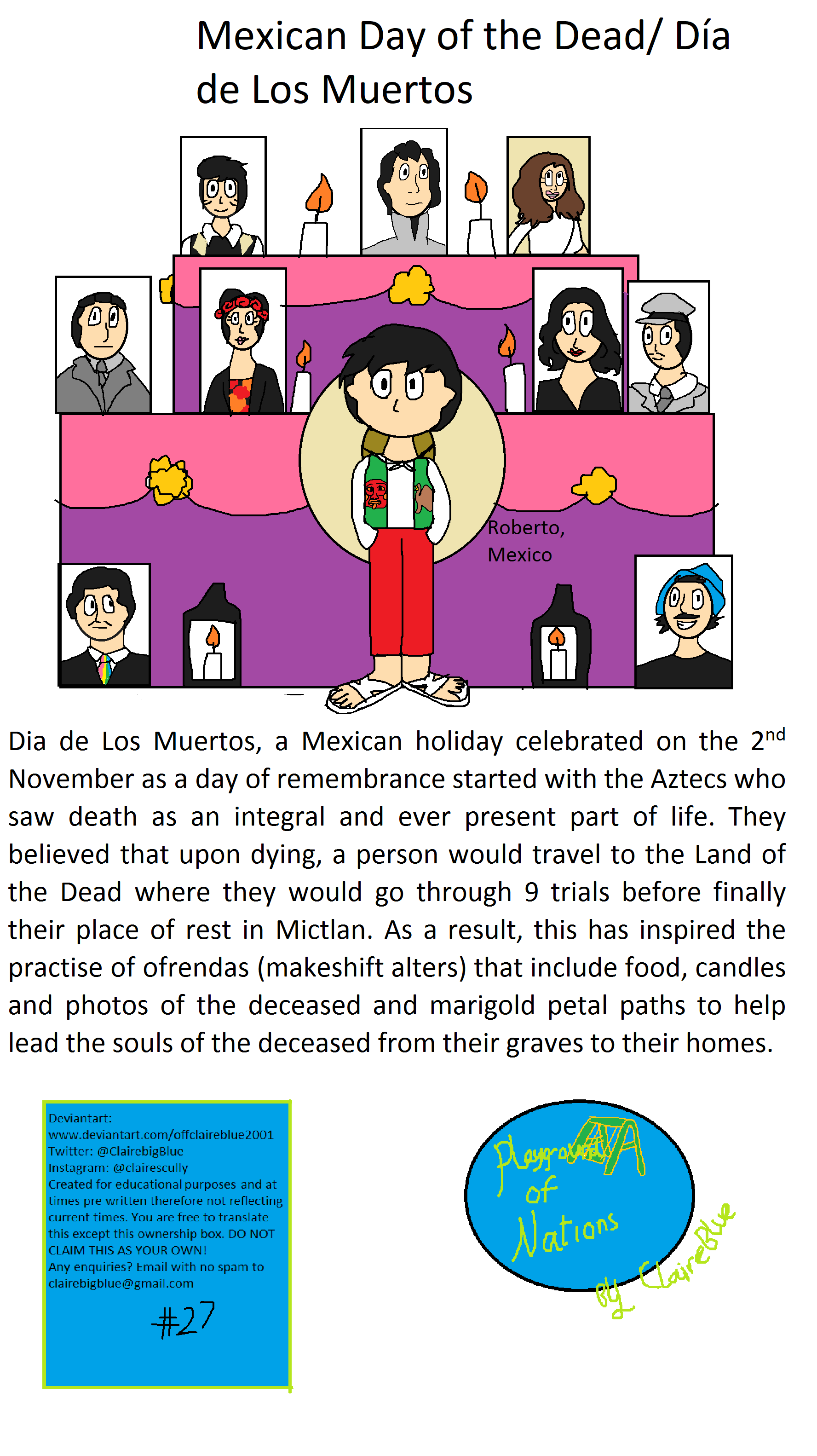 Día de Los Muertos, a Mexican holiday celebrated on the 2nd November as a day of remembrance started with the Aztecs who saw death as an integral and ever present part of life. They believed that upon dying, a person would travel to the Land of the Dead where they would go through 9 trials before finally their place of rest in Mictlan. As a result, this has inspired the practise of ofrendas (makeshift alters) that include food, candles and photos of the deceased and marigold petal paths to help lead the souls of the deceased from their graves to their homes.