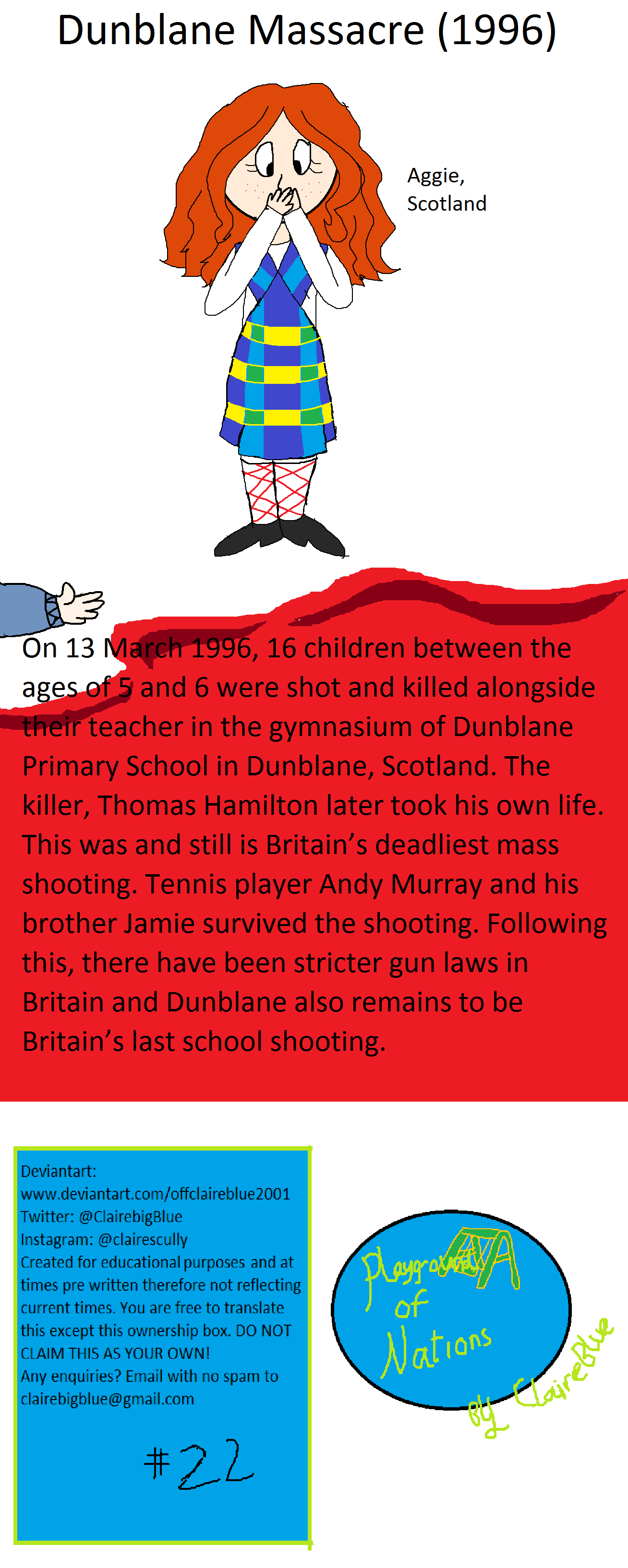 On 13 March 1996, 16 children between the ages of 5 and 6 were shot and killed alongside their teacher in the gymnasium of Dunblane Primary School in Dunblane, Scotland. The killer, Thomas Hamilton later took his own life. This was and still is Britain's deadliest mass shooting. Tennis player Andy Murray and his brother Jamie survived the shooting. Following this, there have been stricter gun laws in Britain and Dunblane also remains to be Britain's last school shooting.