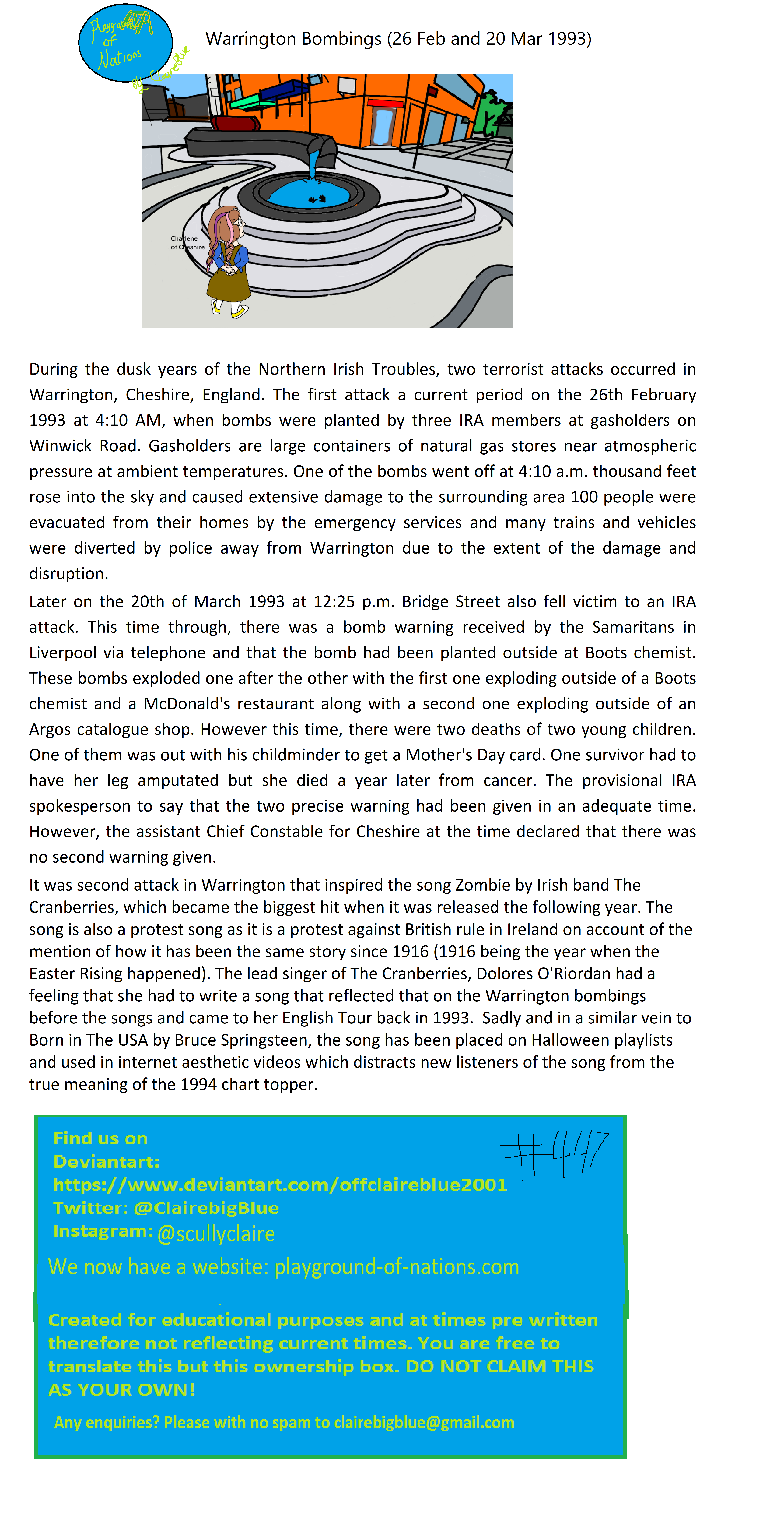 It was second attack in Warrington that inspired the song Zombie by Irish band The Cranberries, which became the biggest hit when it was released the following year. The song is also a protest song as it is a protest against British rule in Ireland on account of the mention of how it has been the same story since 1916 (1916 being the year when the Easter Rising happened). The lead singer of The Cranberries, Dolores O'Riordan had a feeling that she had to write a song that reflected that on the Warrington bombings before the songs and came to her English Tour back in 1993. Sadly and in a similar vein to Born in The USA by Bruce Springsteen, the song has been placed on Halloween playlists