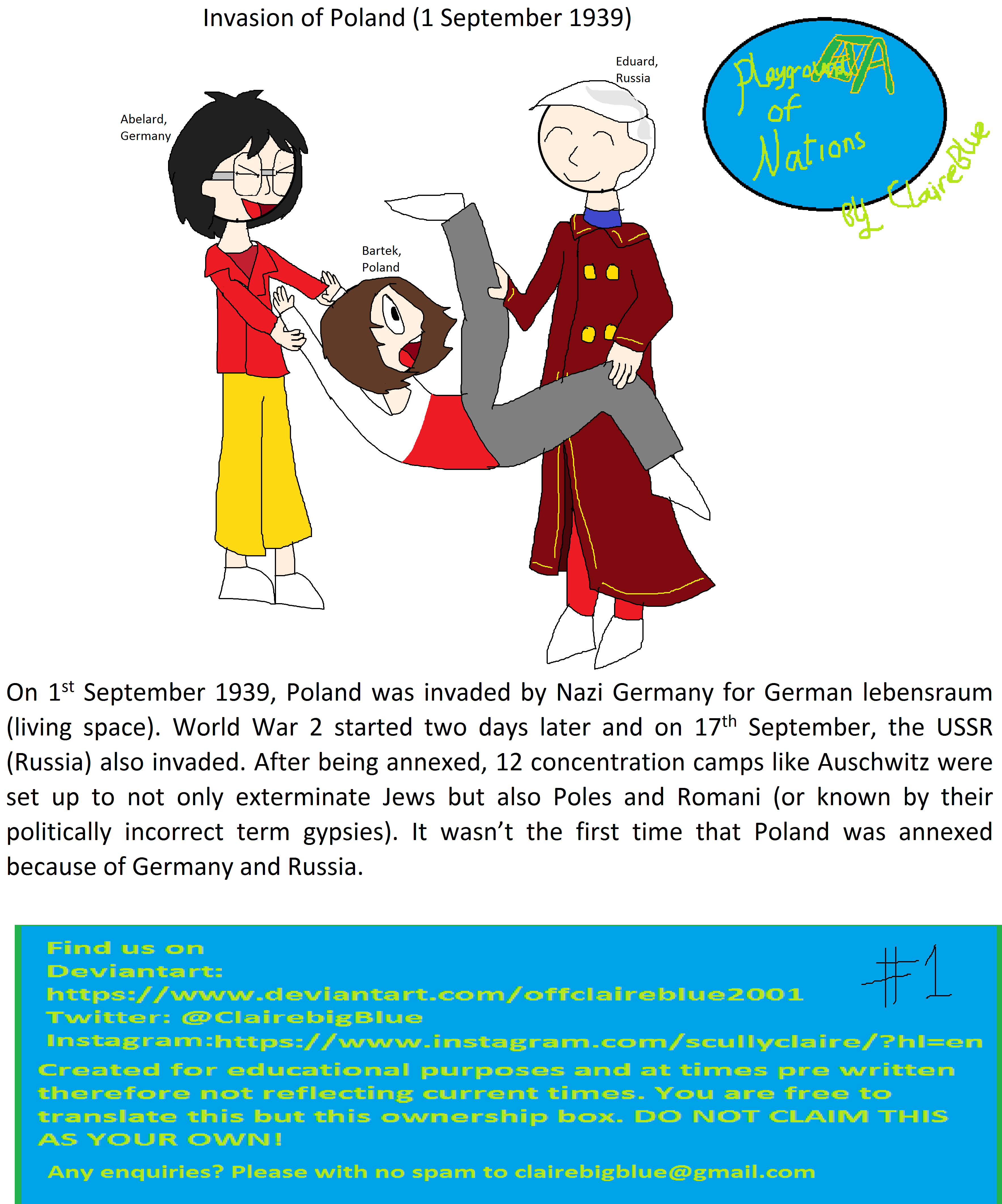 On 1st September 1939, Poland was invaded by Nazi Germany for German lebensraum (living space). World War 2 started two days later and on 17th September, the USSR (Russia) also invaded. After being annexed, 12 concentration camps like Auschwitz were set up to not only exterminate Jews but also Poles and Romani (or known by their politically incorrect term gypsies). It wasn't the first time that Poland was annexed because of Germany and Russia.