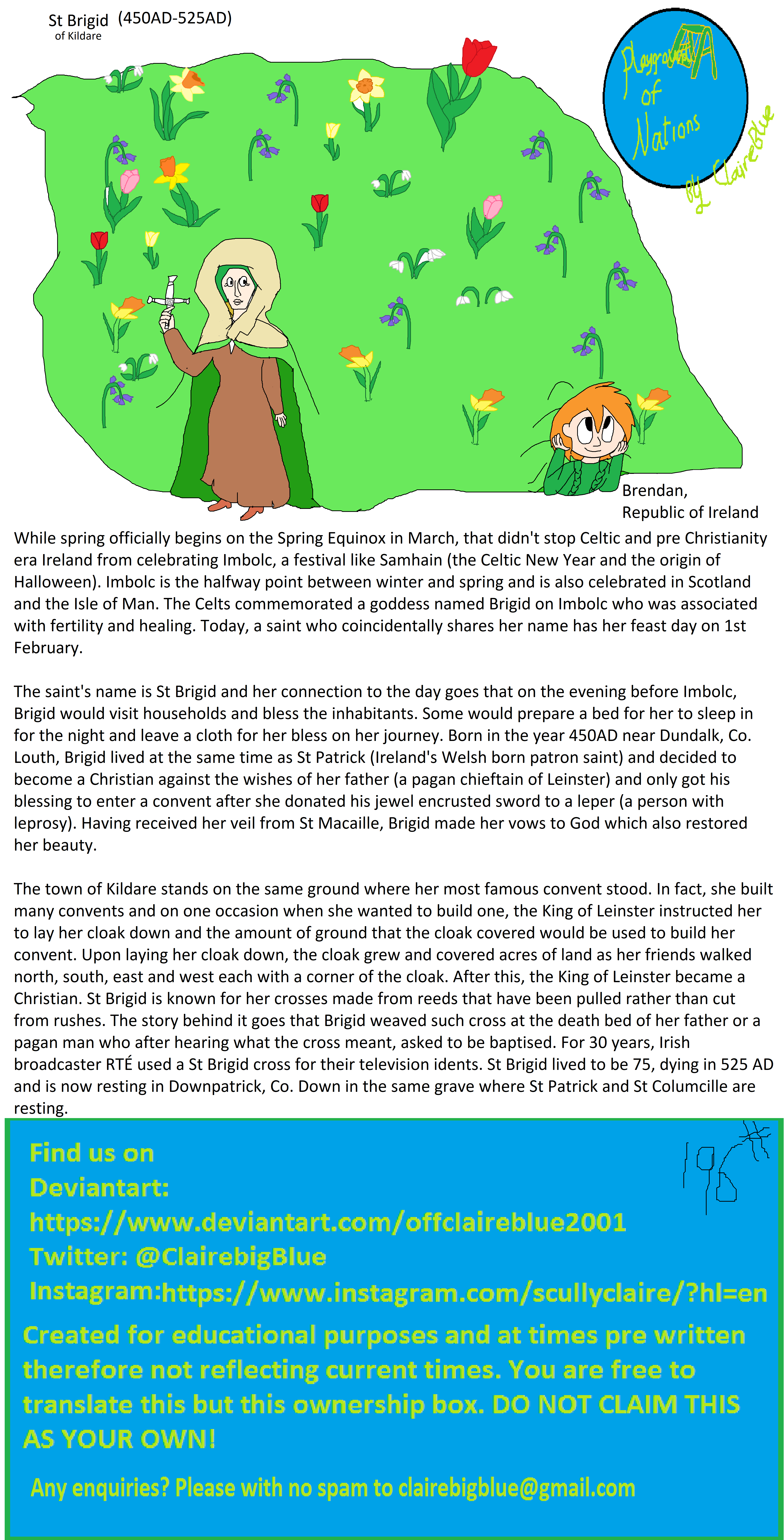 The saint's name is St Brigid and her connection to the day goes that on the evening before Imbolc, Brigid would visit households and bless the inhabitants. Some would prepare a bed for her to sleep in for the night and leave a cloth for her bless on her journey. Born in the year 450AD near Dundalk, Co. Louth, Brigid lived at the same time as St Patrick (Ireland's Welsh born patron saint) and decided to become a Christian against the wishes of her father (a pagan chieftain of Leinster) and only got his blessing to enter a convent after she donated his jewel encrusted sword to a leper (a person with leprosy). Having received her veil from St Macaille, Brigid made her vows to God which also restored her beauty.