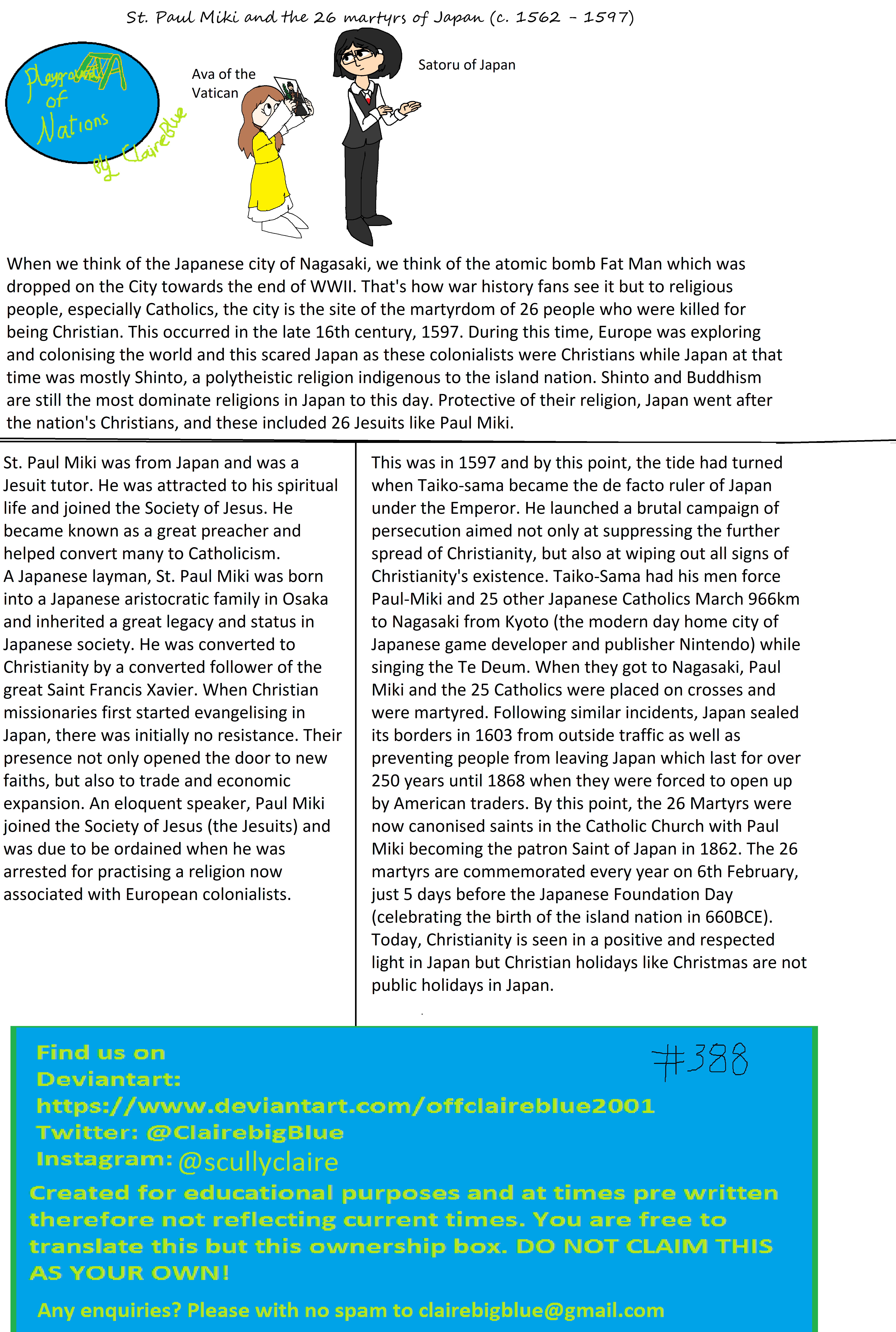 When we think of the Japanese city of Nagasaki, we think of the atomic bomb Fat Man which was dropped on the City towards the end of WWII. That's how war history fans see it but to religious people, especially Catholics, the city is the site of the martyrdom of 26 people who were killed for being Christian. This occurred in the late 16th century, 1597. During this time, Europe was exploring and colonising the world and this scared Japan as these colonialists were Christians while Japan at that time was mostly Shinto, a polytheistic religion indigenous to the island nation. Shinto and Buddhism are still the most dominate religions in Japan to this day. Protective of their religion, Japan went after the nation's Christians, and these included 26 Jesuits like Paul Miki.