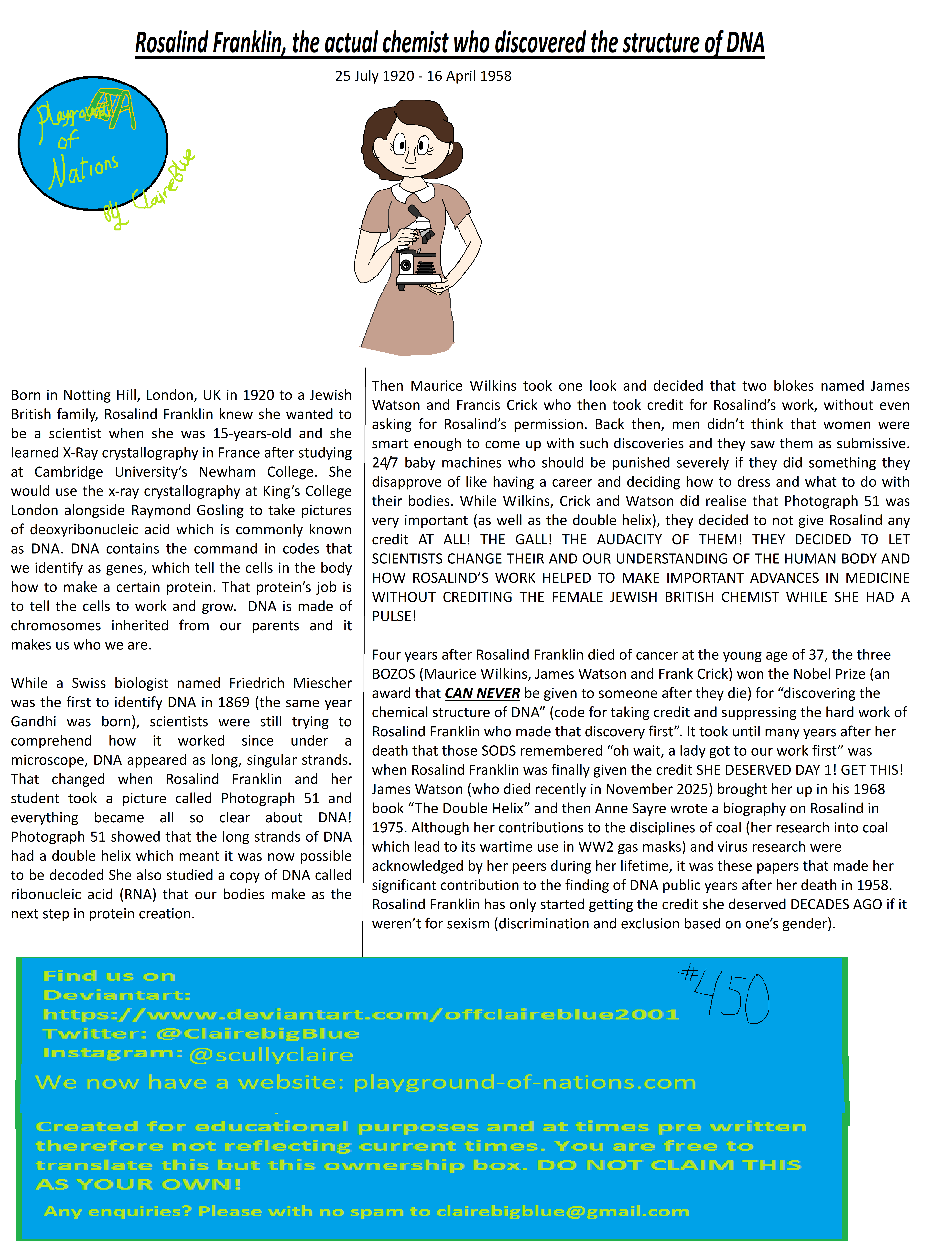 Then Maurice Wilkins took one look and decided that two blokes named James Watson and Francis Crick who then took credit for Rosalind’s work, without even asking for Rosalind’s permission. Back then, men didn’t think that women were smart enough to come up with such discoveries and they saw them as submissive. 24/7 baby machines who should be punished severely if they did something they disapprove of like having a career and deciding how to dress and what to do with their bodies. While Wilkins, Crick and Watson did realise that Photograph 51 was very important (as well as the double helix), they decided to not give Rosalind any credit AT ALL! THE GALL! THE AUDACITY OF THEM! THEY DECIDED TO LET SCIENTISTS CHANGE THEIR AND OUR UNDERSTANDING OF THE HUMAN BODY AND HOW ROSALIND’S WORK HELPED TO MAKE IMPORTANT ADVANCES IN MEDICINE WITHOUT CREDITING THE FEMALE JEWISH BRITISH CHEMIST WHILE SHE HAD A PULSE!