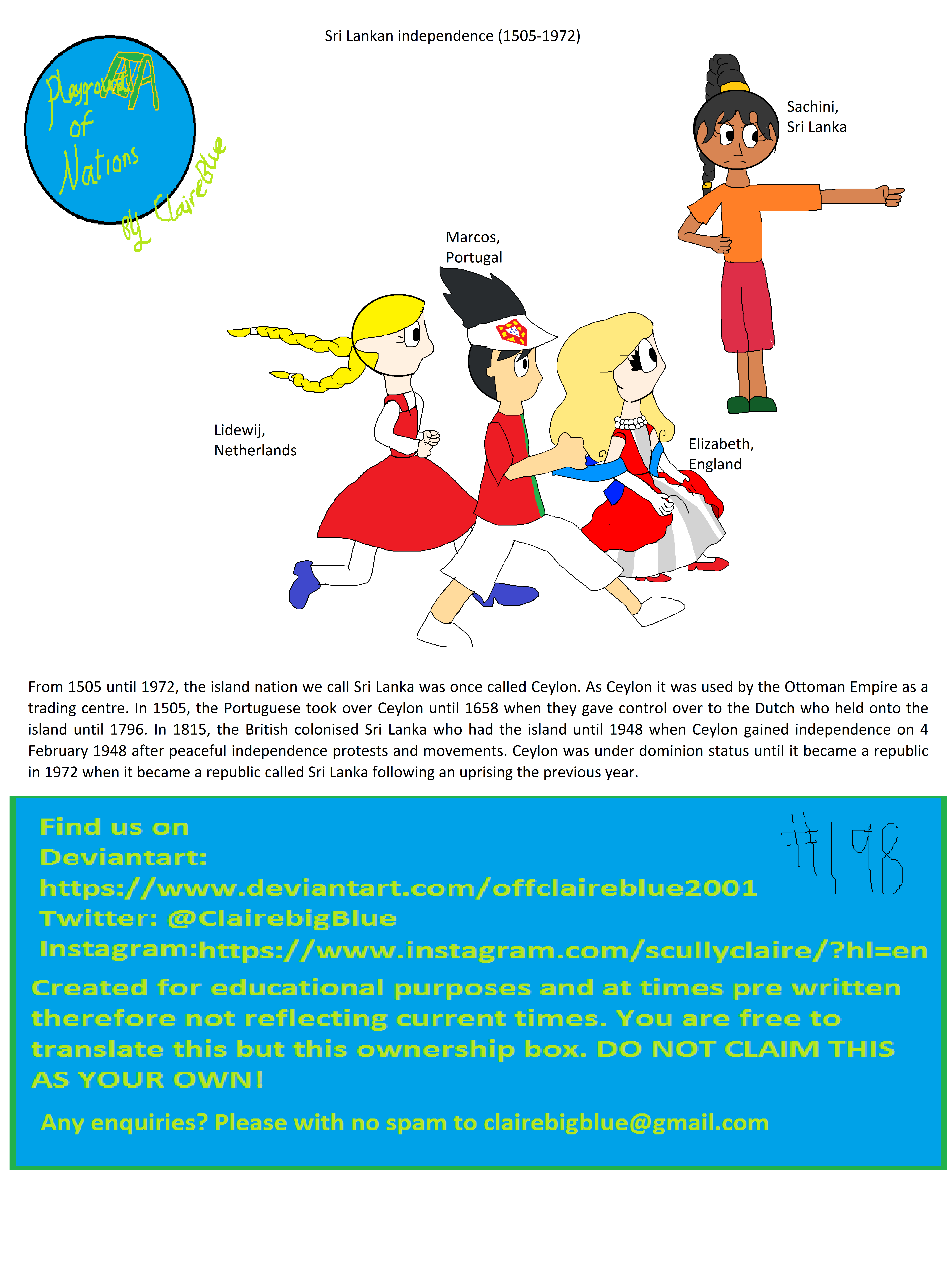 From 1505 until 1972, the island nation we call Sri Lanka was once called Ceylon. As Ceylon it was used by the Ottoman Empire as a trading centre. In 1505, the Portuguese took over Ceylon until 1658 when they gave control over to the Dutch who held onto the island until 1796. In 1815, the British colonised Sri Lanka who had the island until 1948 when Ceylon gained independence on 4 February 1948 after peaceful independence protests and movements. Ceylon was under dominion status until it became a republic in 1972 when it became a republic called Sri Lanka following an uprising the previous year.